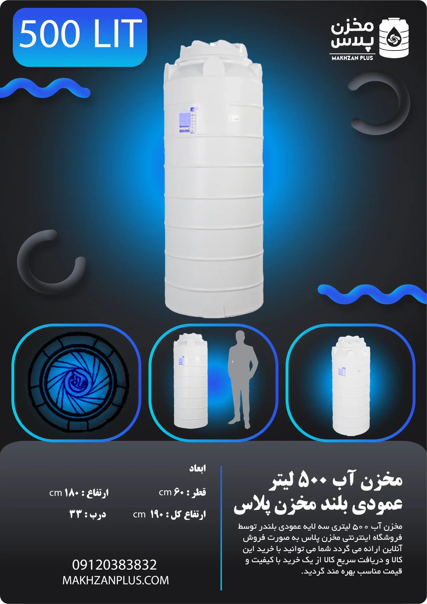 مخزن آب ۵۰۰ لیتری پلی اتیلن عمودی بلند سه لایه توسط فروشگاه اینترنتی مخزن پلاس به صورت آنلاین و تلفنی ارائه می گردد شما میتوانید با خرید این مخزن آب به همراه گارانتی ۱۰ ساله و ارسال سریع از یک خرید با کیفیت بهره مند شوید .