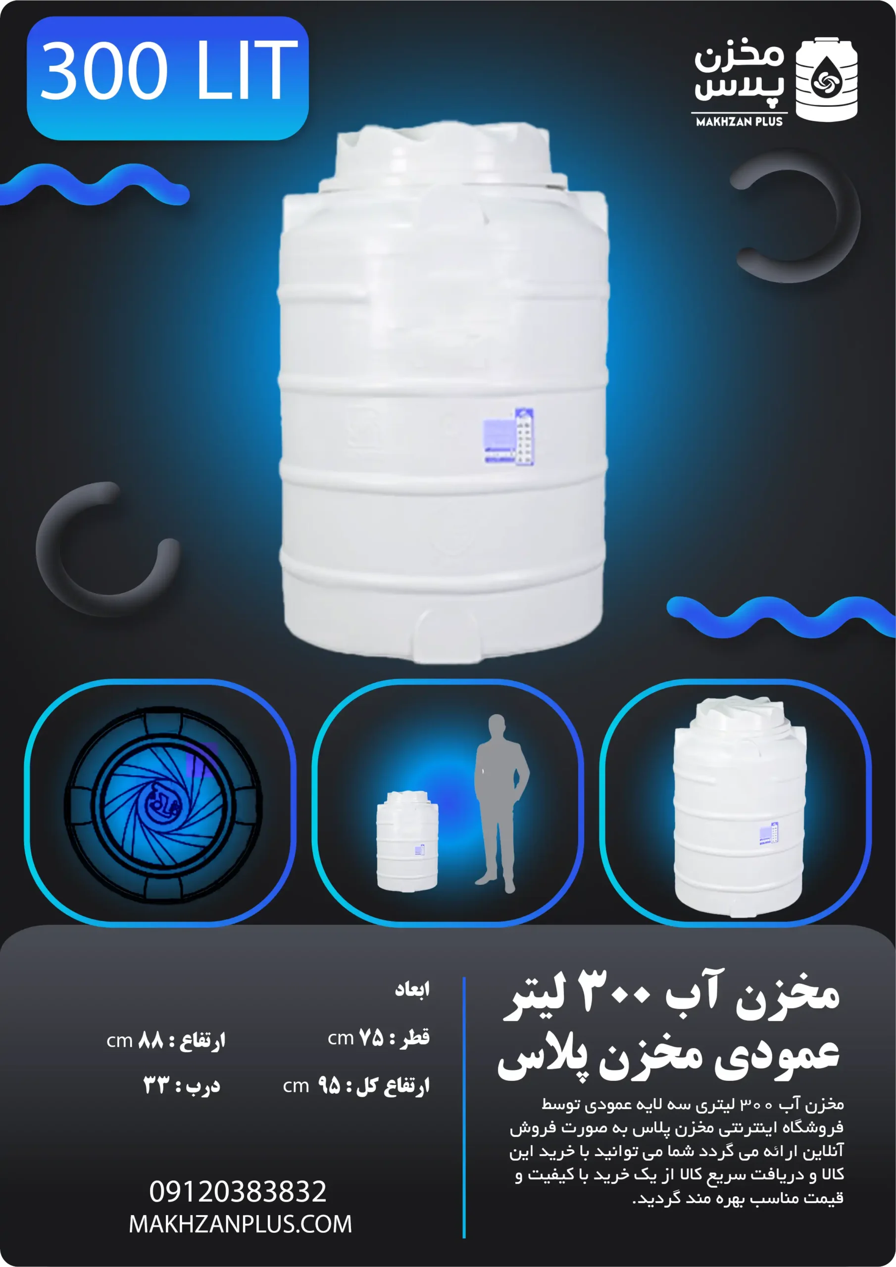 مخزن آب ۳۰۰ لیتری پلی اتیلن عمودی سه لایه توسط فروشگاه اینترنتی مخزن پلاس به صورت آنلاین و تلفنی ارائه می گردد شما میتوانید با خرید این مخزن آب به همراه گارانتی ۱۰ ساله و ارسال سریع از یک خرید با کیفیت بهره مند شوید .